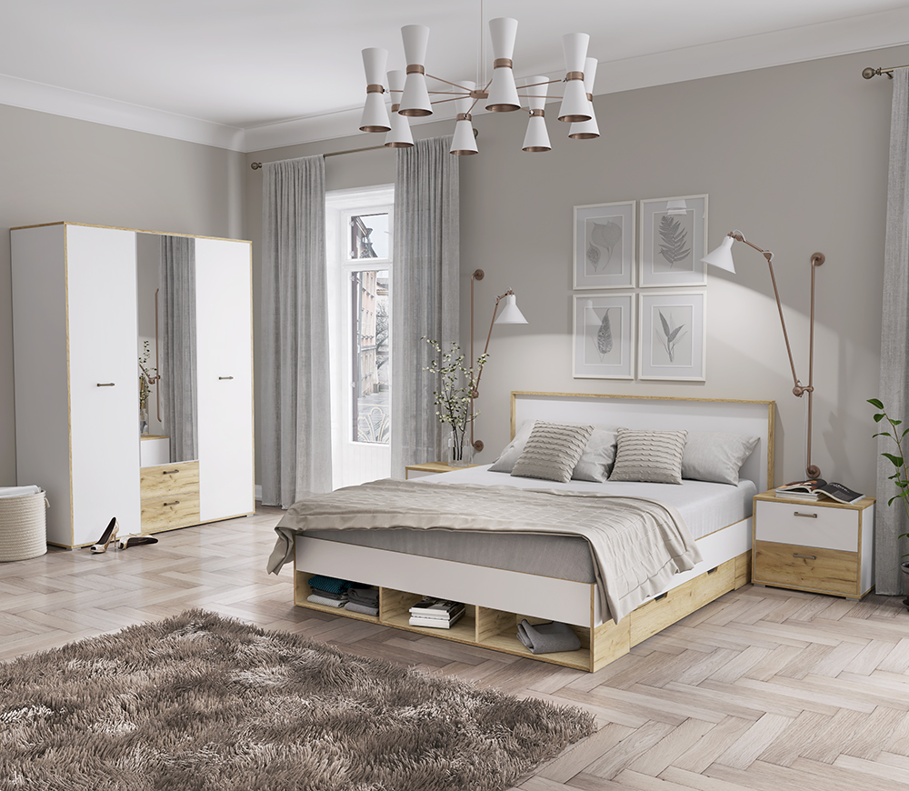 Стандартная комплектация спальни – это кровать, две прикроватные тумбочки, комод, шкаф и туалетный столик. Это отличный вариант сэкономить бюджет, ведь готовые решения обойдутся Вам дешевле и в один клик помогут приобрести полноценную спальню.