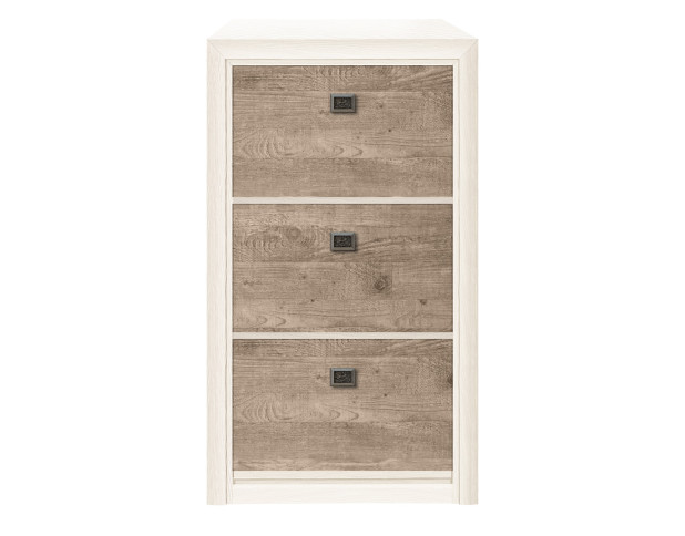 Система КОЕН II Тумба для обуви_BUT3D поможет вам легко и непринужденно поддерживать заветный порядок в доме. Ведь никого не радует, когда при входе в квартиру вас встречают разбросанные отовсюду туфли. Теперь это всё добро может с легкостью расположится на удобных полках тумбы. Характеристика мебели радует фактурным цветом Сосна каньон/дуб корабельный. Материалы, из которых изготовлена тумба, являются безопасными для здоровья и удобными при длительной эксплуатации. За откидными дверями расположены однорядные кассеты для обуви.