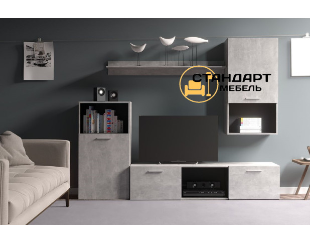 Тумба ТВ – 1 шт. Состоит из открытого отделения и двух отделений за откидными дверьми. В открытое отделение вставляется декоративная тумба опция. Вертикальные опорные стенки корпуса соединены горизонтальными крышками. Тумба устанавливается на пластиковые ножки.